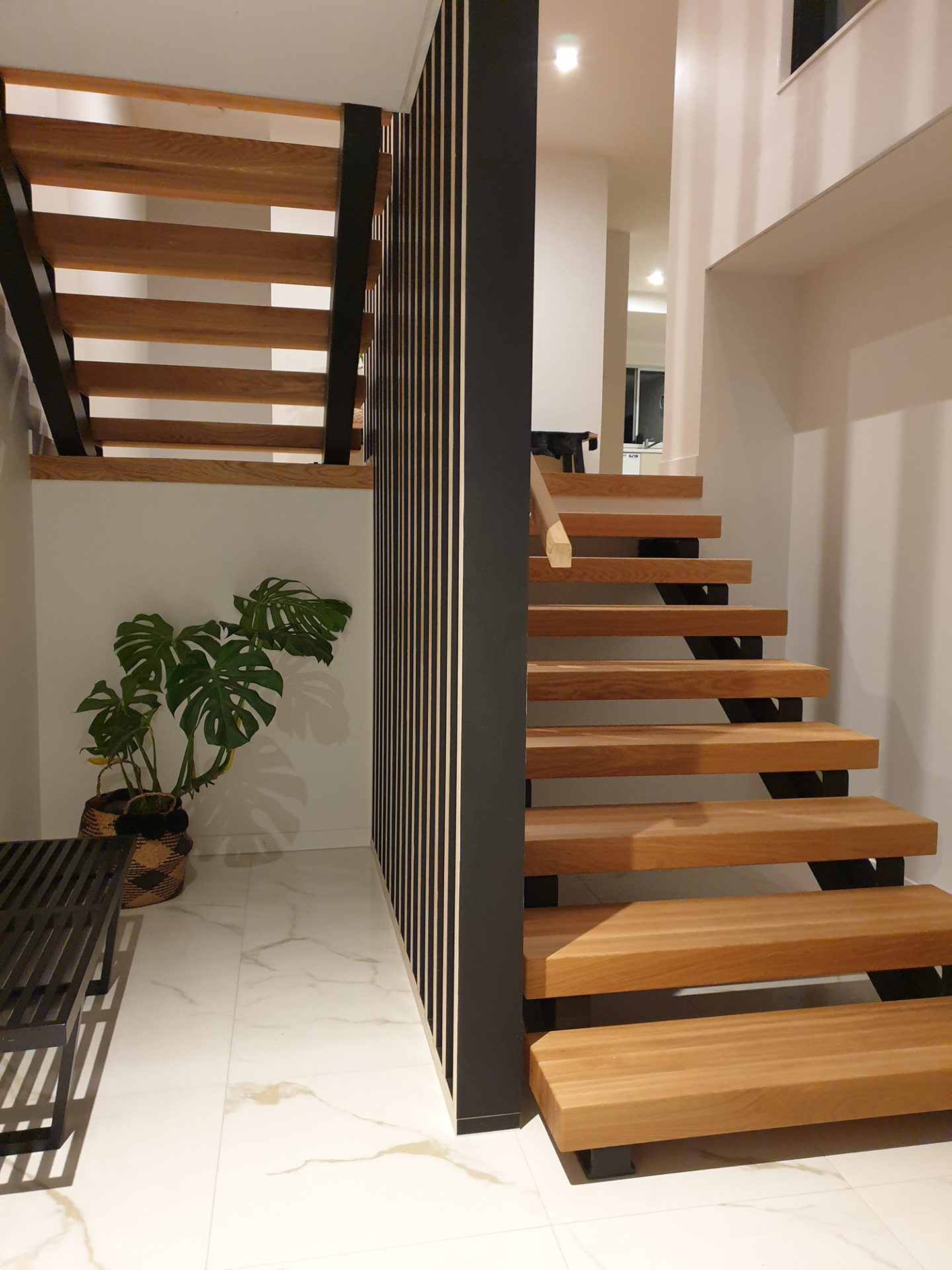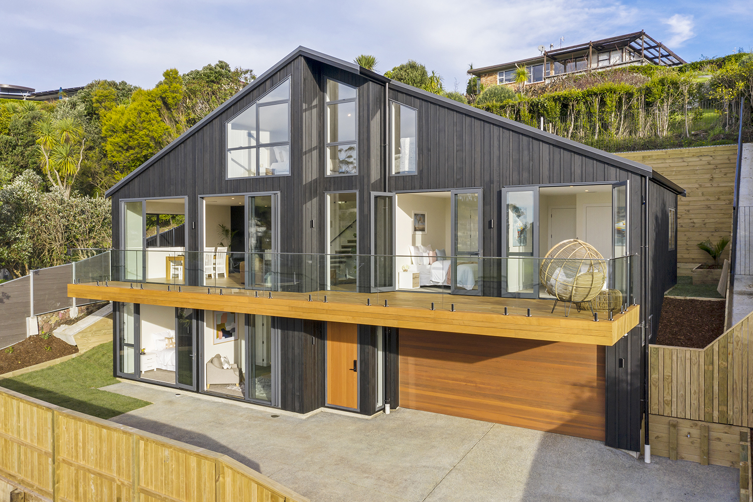 With beautiful internal finishes such as American Oak stair treads and floors, black laminated ply fin stair screen, vitex decking, and double glazed black architectural suite windows; and external touches such as vertical shiplap cedar highlighting the 2nd story inset and a combination of titan board, vertical stria cladding, and horizontal weatherboard on the main extension.